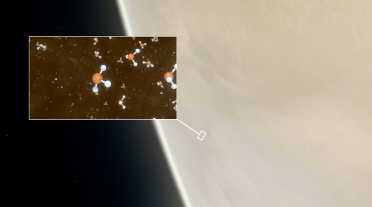 我们的邻居金星的艺术想象,科学家已经证实在那里发现了磷化氢分子,插图中展示了磷化氢分子。这些分子是由麦克斯韦望远镜和阿塔卡玛毫米/亚毫米波阵列望远镜在金星高空云层中探测到的。(Credit: ESO/M. Kornmesser/L. Calçada & NASA/JPL/Caltech)