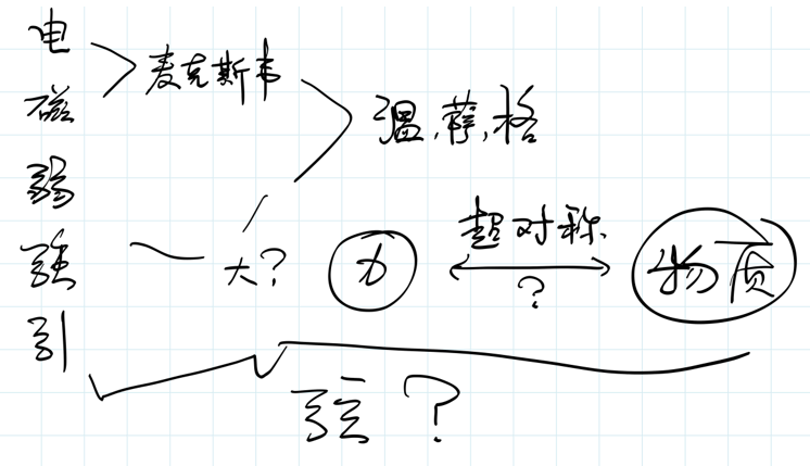 之后,大家又猜测有可能存在一种大统一理论,可以统一电磁、弱、强相互作用。当然,不管是麦克斯韦的统一,还是电弱统一和大统一,所讲的都是力的统一,而力和物质看起来是非常不一样的存在。但是有一个猜想叫做“超对称”,认为有一种假想的对称性,可以把物质和力相互转化。也就是说,在一定程度上把物质和力也统一到了一起。