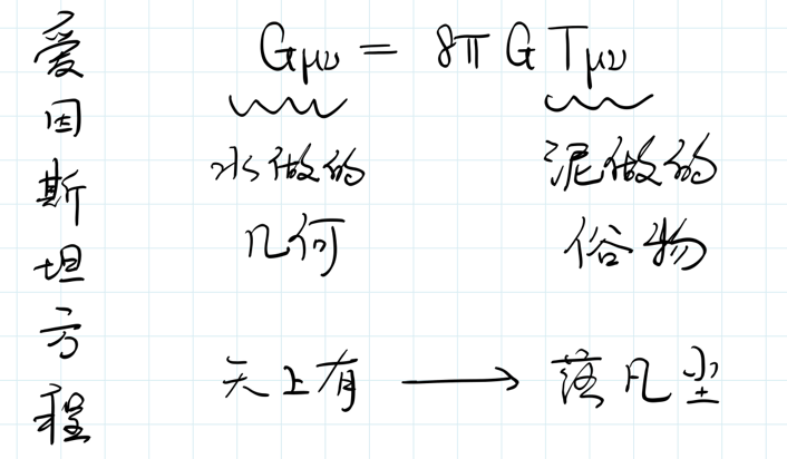 我们从爱因斯坦讲起。爱因斯坦的广义相对论研究的是物质分布和时空弯曲的关系,即物质和空间几何的关系。两者的关系可以由爱因斯坦方程来描述,该方程的左边是几何,即空间是如何弯曲的,而右边是物质,即物质是如何分布的。爱因斯坦本人对这个方程左右两边的好恶是完全不一样的,爱因斯坦认为方程右边的物质是所谓的“俗物”,好比“泥”做的一样,而方程左边的几何是数学的、美妙的、精密的,爱因斯坦喜欢它们“水”做的那样的纯粹。爱因斯坦觉得,只应天上有的几何和落到凡尘的物质不应该匹配起来。一个真正美妙的方程,方程的右边即所谓的物质应该也是几何化的,也就是说,爱因斯坦希望把物质也统一到几何的框架当中。这就是爱因斯坦的梦想——所谓的“统一场论”。