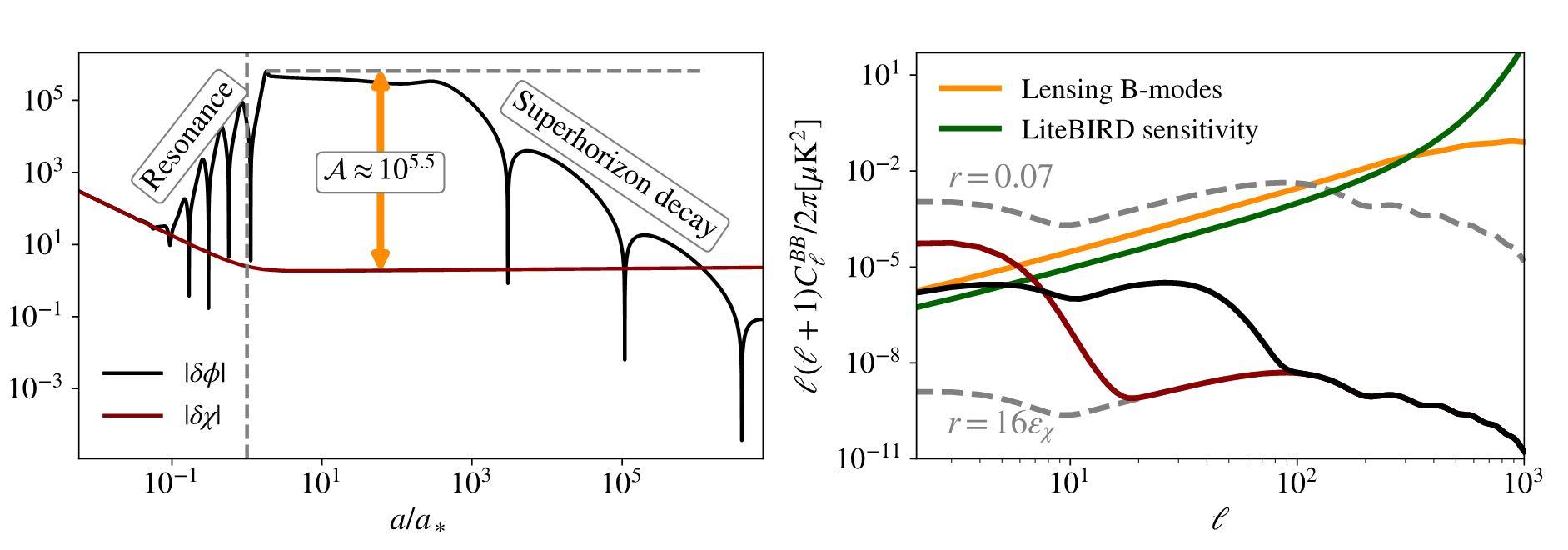 在本研究中,蔡一夫团队引入了一个具有参数共振演化行为的重场,使其与原初引力波发生非线性耦合,从而为原初引力波的共振增益提供了能量来源。并且暴胀背景演化的特殊动力学性质(专业术语为,慢滚暴胀)可使该重场和传统的原初物质扰动之间几乎互不干扰,从而确保暴胀学说与当前的宇宙学观测能够完美契合。