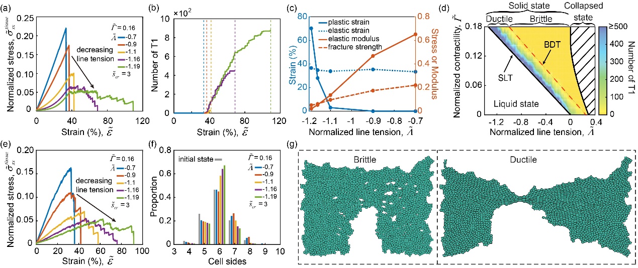 针对以上问题,姜洪源课题组通过引入一种新的拓扑转换(T4转变),发展了一种改进的细胞顶点模型,研究了上皮细胞单层的力学性质和断裂破坏机制。该研究团队发现了一种由单细胞力学性质及细胞间粘附性质决定的脆韧转变现象,揭示了外加荷载可以激活韧性细胞单层中的细胞重排布行为,其塑性变形来源于细胞单层内部与石墨烯等二维材料中常见的拓扑缺陷类似的“5-7缺陷”的形核和扩展。最后,该团队通过一个简化的四细胞模型,进一步证明了这种脆韧转变是由细胞重排和细胞脱粘的竞争引起的。该项工作为研究活体组织的断裂破坏提供了一个理论框架,并可能对许多其它生物学过程,例如伤口愈合和组织形貌发生,具有重要意义。