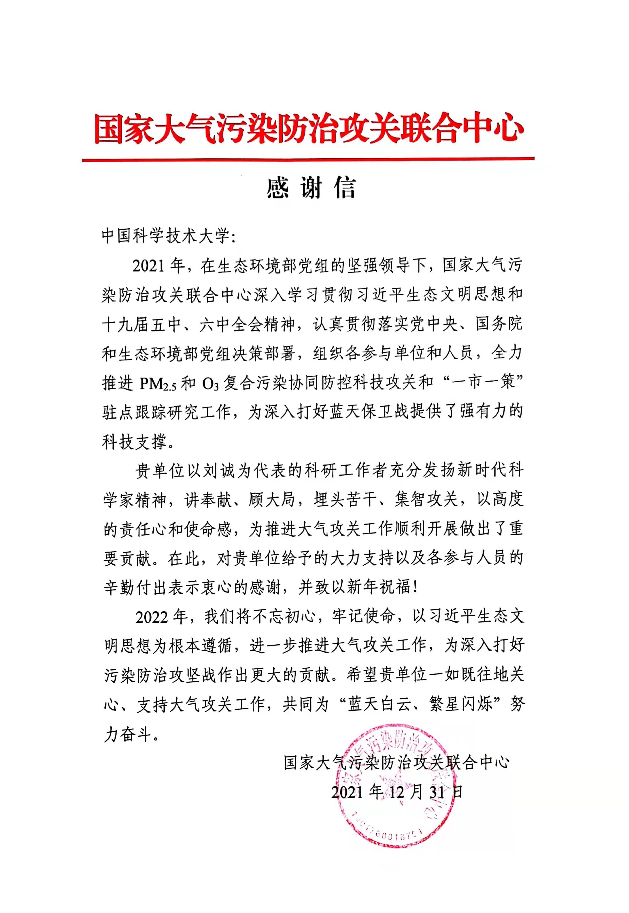 2022年伊始,我校收到了来自国家大气污染防治攻关联合中心(以下简称“攻关联合中心”)发来的感谢信。攻关联合中心就我校为其在完成推进“大气PM2.5和O3复合污染协同防控科技攻关”和“一市一策”驻点跟踪研究的国家重大决策部署时提供强有力的科技支撑表示了衷心感谢。