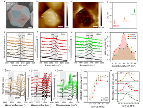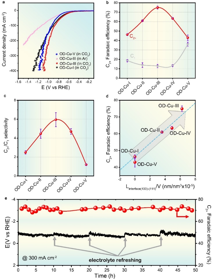 电化学测试表明,在电流密度为100 ~ 400 mA cm−2时,与其它铜催化剂相比,具有最多Cu(100)/Cu(111)界面的OD-Cu-III催化剂更有利于催化二氧化碳到多碳产物的转化(图2)。例如,在300 mA cm-2的电流密度下,该催化剂展现了74.9±1.7%的多碳产物选择性。研究人员发现,多碳产物的选择性与Cu(100)/ Cu(111)界面的长度呈现线性相关,证明该界面为催化C-C耦联的活性位点。