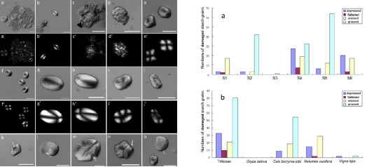 图2.双墩遗址石质工具表面提取到的古代残留淀粉粒及不同损伤特征淀粉粒的分布