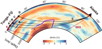 图2 南-北剖面上太平洋LLVP北部边界结构。紫色线描绘了我们推断的LLVP形态,它具有向北倾斜的特征。