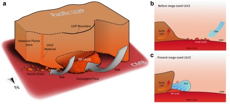 图3 太平洋LLVP北部边界处超大尺度ULVZ的形成。a)ULVZ,LLVP边界与夏威夷下方地幔热柱的位置。b)小尺度ULVZ在长期稳定的水平地幔流的推动下不断向LLVP的边缘靠近。c)b中小尺度ULVZ在地幔流的作用下,最终汇聚成我们探测到的超大尺度ULVZ。同时,在地幔流的作用下,LLVP也形成了向北倾斜的几何形态。