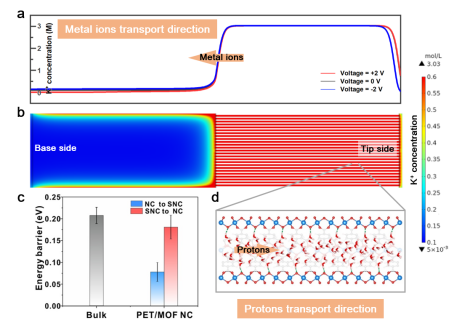 蒙纳士大学王焕庭教授研究团队制备了一种由金属有机物框架(metal-organic framework, MOF)和聚对苯二甲酸乙二醇酯(polyethylene terephthalate, PET)组合而成的非均质通道结构。具体做法是将MIL-53-COOH亚纳米通道填充在子弹头形状的PET纳米孔道的尖端,形成MOF亚纳米和PET纳米通道复合的非对称结构。这种非对称的纳米通道同时具备沿尖端向基端的金属离子整流效应和沿基端向尖端的质子整流效应,两种粒子的整流比均达到100以上。同时,该非均质通道结构具有很好的整流稳定性,在苛刻的pH条件和多次重复电压加载中都展现出金属离子和质子的快速整流传输。
