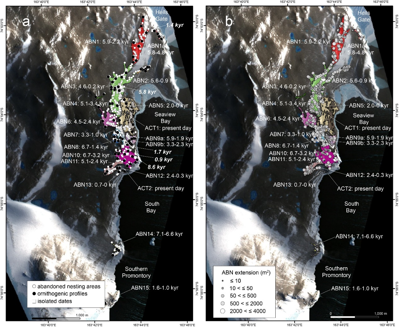 研究团队提出废弃巢区年代和面积测定相结合的方法,系统恢复了全新世以来的企鹅种群数量变化和巢区迁移过程。发现距今7000-3000年间,恩克斯堡岛的种群数量大致呈增加趋势,在5500-5000和4000-3500年达到峰值。在3500-3000年的短暂下降后,企鹅种群3000-1500年间显著扩张,与南部斯科特海岸大规模聚落废弃相对应。罗斯海斯科特海岸在距今5-4千年遍布企鹅繁殖地,却在距今3-2千年大规模废弃,关于废弃的原因长期以来存在“变冷说”和“变暖说”两种观点。此前,谢周清课题组在企鹅粪土层中找到关键证据,提出“新冰期”变冷条件下区域海冰扩张和局部地形影响下的风和积雪增加是导致斯科特海岸废弃的主要原因,解答了争论已久的“企鹅消失之谜”,并系统重建了罗斯海历史时期企鹅繁殖地分布的演变过程(图2)(Quaternary Science Reviews, 264, 2021)。在此基础上,本研究提出特拉诺瓦湾冰间湖提供的无冰环境使其恩克斯堡岛在近岸海冰扩张的时期接纳了来自斯科特海岸的迁徙企鹅种群,致使企鹅数量大幅增加,成为了区域企鹅种群的宝贵避难所。论文指出,近几十年罗斯海的近岸海冰呈现出增加趋势,因此恩克斯堡岛等有冰间湖分布的区域将会对企鹅种群的延续发挥更为关键的作用。