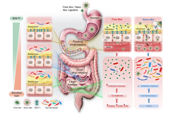抗生素具有抗菌效果广谱、生产成本低和临床应用方便等优点,而被广泛应用于细菌感染的治疗,是抗细菌感染治疗的基石。目前抗生素的给药方式以口服为主,口服广谱抗生素在杀死致病菌的同时,也会严重破坏肠道菌群的稳态,进而引起肠道菌群失调相关疾病的发生。研究表明,口服抗生素会导致肠道菌群种类和数量的长期改变,并且无法恢复到原来的组成。此外,口服抗生素减少肠道共生菌和改变微生物群组成的同时,会进一步影响肠道的免疫防御,增加细菌性肠炎、代谢性疾病以及哮喘等多种疾病发生的风险,还会筛选出耐药菌株,导致人类微生物群成为一个巨大的耐药基因库,而越来越多的广谱耐药细菌的出现给现代医学带来了重大挑战。因此,在口服抗生素治疗细菌感染的同时,如何让抗生素增效又少“误伤”肠菌,做到两全其美,是目前细菌感染治疗领域亟需解决的重大难题,解决该问题具有重要的科学意义和社会价值。