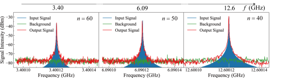 在本工作中,研究团队基于室温铯原子体系,利用里德堡原子对微波的混频响应性质,将微波频率梳信号设置为本振信号(如图1所示),演示了基于里德堡微波频率梳谱仪的微波绝对频率测量方案,目前可实现的实时响应范围为125 MHz,且有进一步提升的空间。此外,如图2,通过利用不同主量子数的里德堡态,系统实现了对不同中心频率下具有1kHz调制带宽信号的接收。