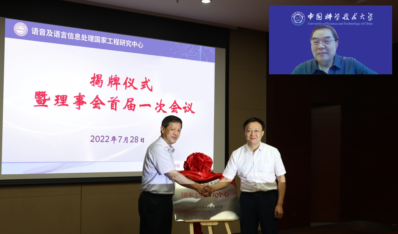 7月28日上午,“语音及语言信息处理国家工程研究中心”揭牌仪式暨理事会首届一次会议及技术委员会首届一次会议在中国科学技术大学科技实验西楼第一会议室举行。中国科学技术大学包信和校长、吴枫副校长,安徽省发展和改革委员会耿晓原二级巡视员,中国科学技术大学鄂维南院士、叶向东院士,科大讯飞股份有限公司刘庆峰董事长,中心理事会成员、技术委员会委员和领导班子成员,中国科学院发展规划局重点实验室处和中国科学技术大学信息与智能学部、科研部等相关领导共30余人出席会议。会议采取线上与线下结合的形式,中国科学技术大学吴枫副校长和科大讯飞集团聆思公司胡郁董事长分别主持了两个阶段的会议。