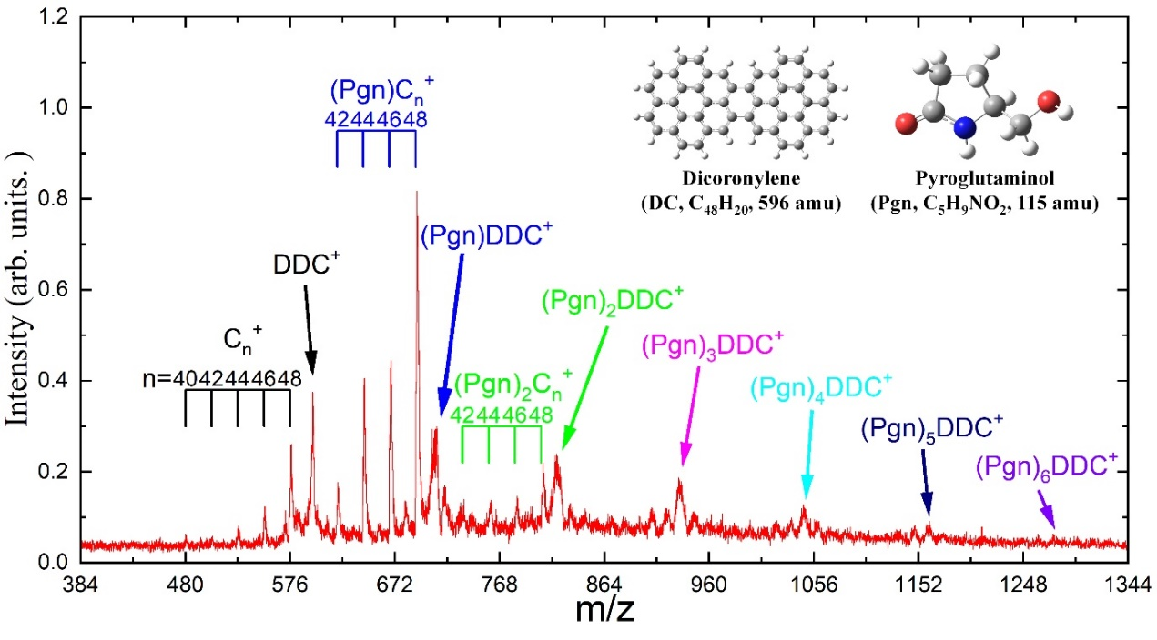 在这项工作中,研究团队利用自主搭建的实验仪器平台研究有机分子-多环芳香烃团簇在离子-分子碰撞反应过程中的稳定性和堆积形成的途径:大质量的多环芳香烃阳离子(二晕苯C48H20+)和有机分子(焦谷氨醇, C5H9NO2)作为反应物的形成和演化途径(见图二,实验结果已经发表在Hu et al.Astronomy & Astrophysics, 2021, 656, A80);对多环芳香烃有机分子团簇((C5H9NO2)1-6C48+, n=[1,6])的形成过程进行了一系列的理论计算(见图三)。