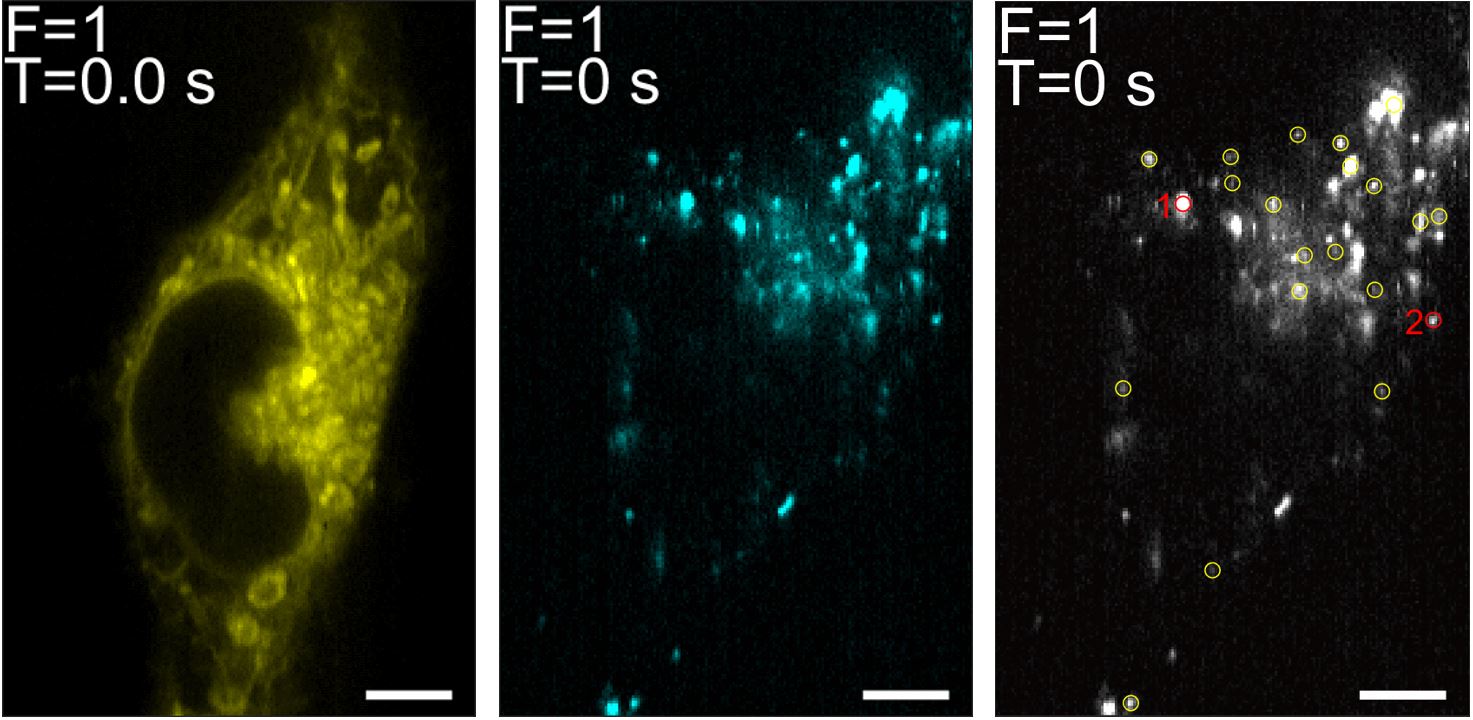 该动态偶氮增强拉曼成像系统用多种拉曼探针对细胞进行同时标记,实现了线粒体、溶酶体和脂滴的同步成像(图2b);成功获取了活细胞中线粒体和溶酶体的快速影像(图3);通过溶酶体的影像数据,分析了溶酶体运动的生物物理动态属性;通过加入解偶联剂FCCP,研究了线粒体解耦动态过程。该动态偶氮增强拉曼成像系统能够对细胞器动态过程进行定量且多元的成像,将为生物医药的研究提供有力的帮助。