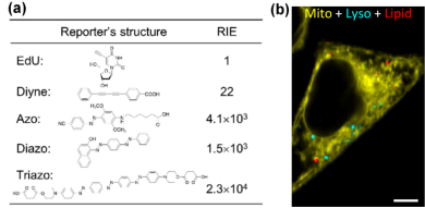 图2.(a)多种拉曼标记物的相对拉曼强度;(b)基于偶氮增强拉曼探针的线粒体、溶酶体和脂滴的同步成像。