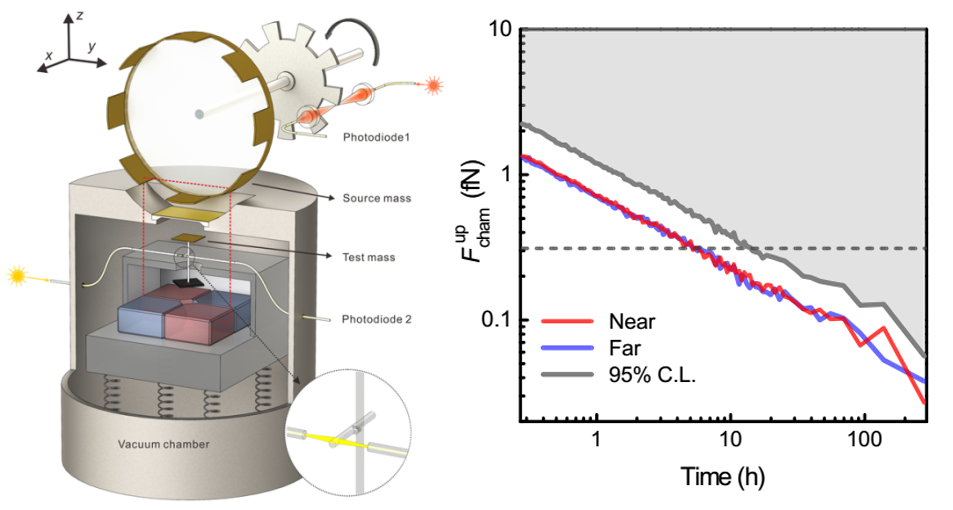 图1:抗磁悬浮力学系统实验系统(左);实验探测给出的变色龙第五种力上限(右)