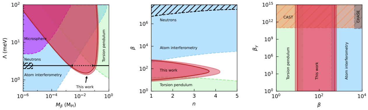 图2:该研究的暗能量探测结果:基础变色龙场与普通物质的耦合界限(左),不同阶数变色龙场与普通物质耦合界限(中),基础变色龙场与光子的耦合界限(右)。其中染色区域是被实验检验并被排除的区域,当前工作检验的区域为红色,与之前报告的实验一起,完全排除了变色龙模型。