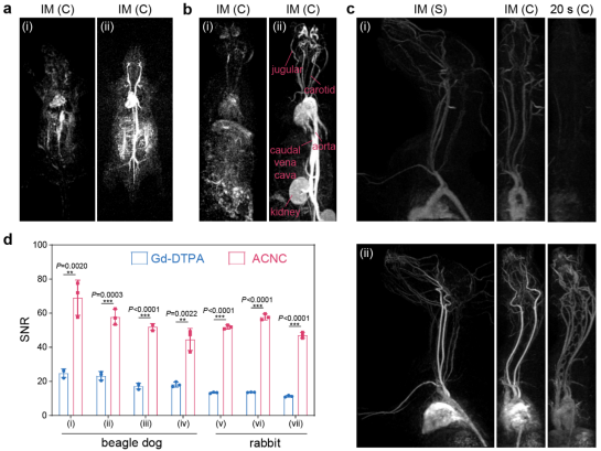 图2.在多种实验动物模型上(a大鼠,b兔子,c比格犬),(i)临床用钆喷酸葡胺注射液(Gd-DTPA)及(ii)无定形钆掺杂碳酸钙纳米簇(ACNC)的磁共振血管成像(MRA)效果与(d)对比增强MRA的信噪比(signal-noise ratio, SNR)的比较。