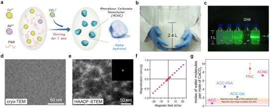图1.a-f无定形钆掺杂碳酸钙纳米簇(ACNC)的制备示意图和相关表征;g文献报道的无定形碳酸钙及其他合成样品对照与ACNC的含水量的对比。