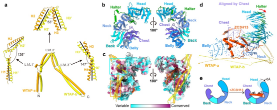 图2. WTAP、VIRMA、ZC3H13的结构及作用关系。a, WTAP的二聚体结构示意图。α-螺旋卷曲螺旋的轴用黑线表示。b, VIRMA的结构示意图。c, VIRMA的序列保守性示意图。WTAP与VIRMA相互作用的区域已用框标出。WTAP和ZC3H13均为半透明表示。d,e,以VIRMA的Belly和Chest结构域为参考,ZC3H13结合后HWV复合物的构象变化。e, ZC3H13的α6和α7结合导致的HWV复合物构象变化的模型。