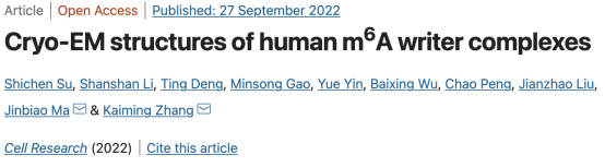 2022年9月27日,中国科学技术大学生命科学与医学部张凯铭团队与复旦大学生命科学学院麻锦彪团队和合作在Cell Research杂志在线发表了题为《Cryo-EM structures of human m6A writer complexes》的文章,该研究首先体外获得了MACOM和MAC复合物(图1b-c),然后通过冷冻电镜解析了两套分辨率在3.0 Å的人源m6A甲基化酶调控亚基复合物MACOM的核心区域原子水平结构(图1f-g),以及整体分辨率为4.4 Å的人源m6A甲基化酶MAC-MACOM复合物整体结构。研究团队结合蛋白质-蛋白质和蛋白质-RNA交联质谱以及pull-down等生化实验与结构分析,阐明了MACOM复合物结构核心区域的组成及结构细节,并提出了MAC-MACOM甲基化修饰RNA的合理模型。