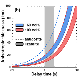 研究分析表明,采用合理的蛇纹石化程度以及定向排列程度,要产生汤加俯冲带约1.8s的延迟时间,需要约60km厚的叶蛇纹石层(图2),这大大超过了地震学观测发现的汤加俯冲带板片中低速层的厚度。然而,同样条件下的利蛇纹石层只需要约30km厚就可以解释,这也与汤加俯冲带板片的低速层厚度一致。因此,利蛇纹石应当在俯冲带浅部广泛分布,这将对认识俯冲带的物理化学过程及地球内部水循环等方面产生重要影响。