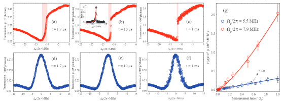 团队利用Fisher information来衡量精度,如图2所示。实验表明,相比于少体无相变的情况,多体系统在临界点的Fisher information具有显著提高,提高了三个数量级。对应于测量精度提升至少一个量级,并且随测量时间的增加而增加,呈现指数增长的趋势。在单体情况下,系统灵敏度约为3.1 μV/cm/Hz^0.5,而在多体情况下,系统对于微波电场的测量灵敏度为49nV/cm/Hz^0.5,提高了60多倍。