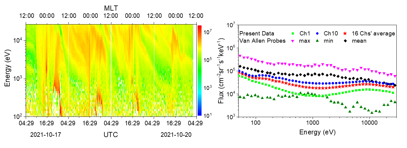 图2.在轨观测结果:左图为空间离子的能量微分通量随能量和时间的变化;右图为空间离子的能量微分通量随能量变化的定量数据。