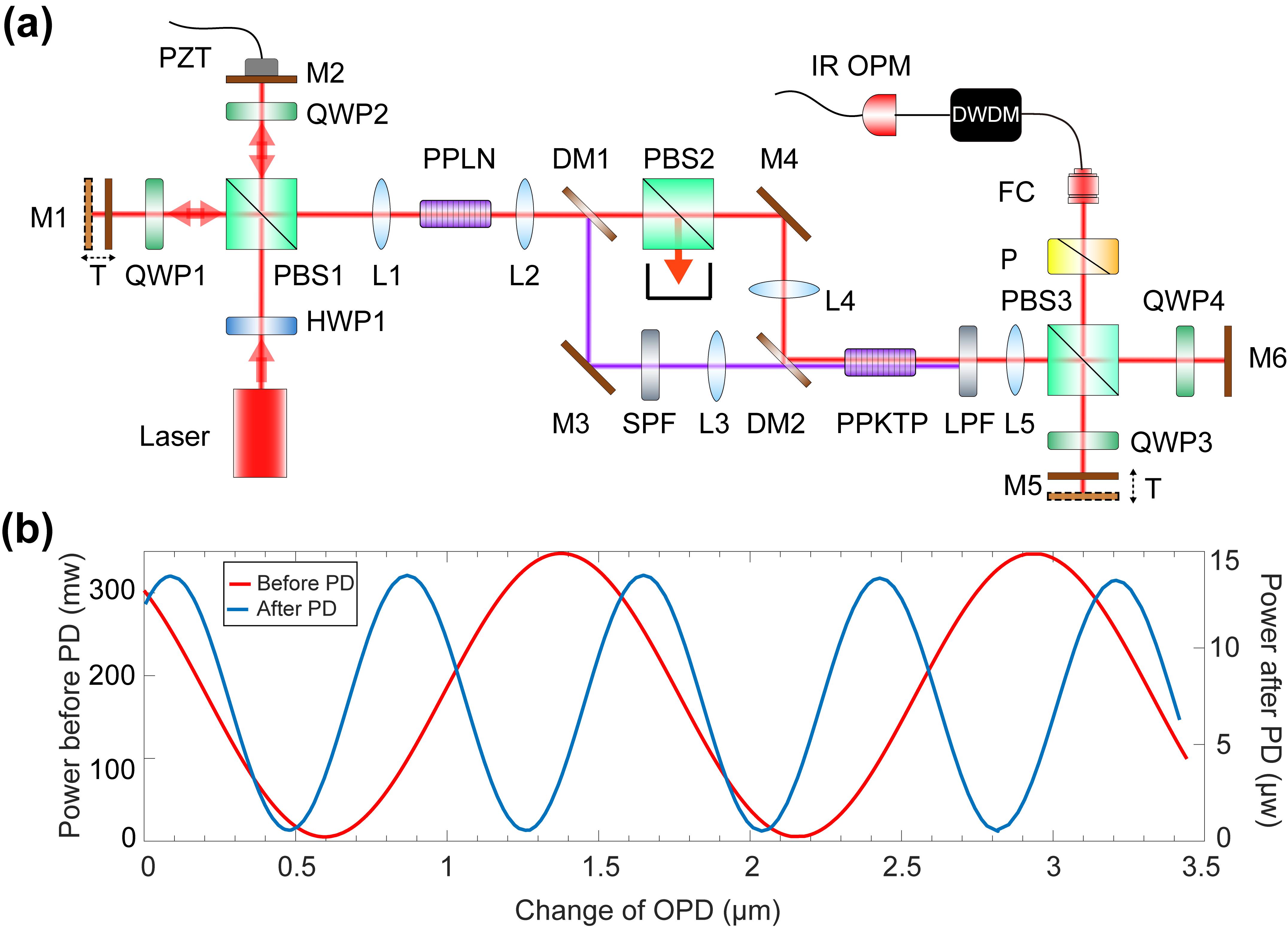 图2.频率无关的相位放大实验原理图。(a)频率无关的相位放大实验装置,(b)实验结果,红色曲线为干涉仪直接出射的基频光干涉结果,蓝色曲线为经过相位放大但光学频率没有改变的干涉结果。