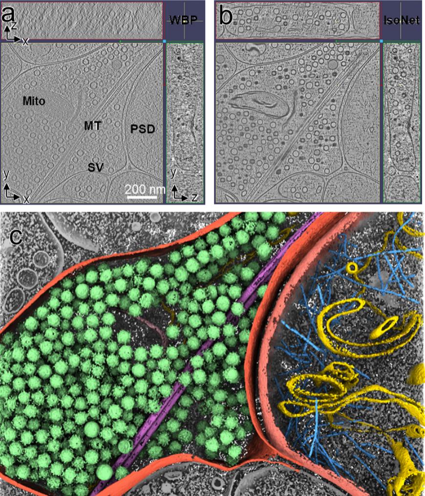 图2.利用IsoNet算法对神经突触cryoET三维重构数据进行处理前、后的效果,以及对IsoNet算法处理后神经突触中超微结构基于真实电子密度的三维可视化渲染