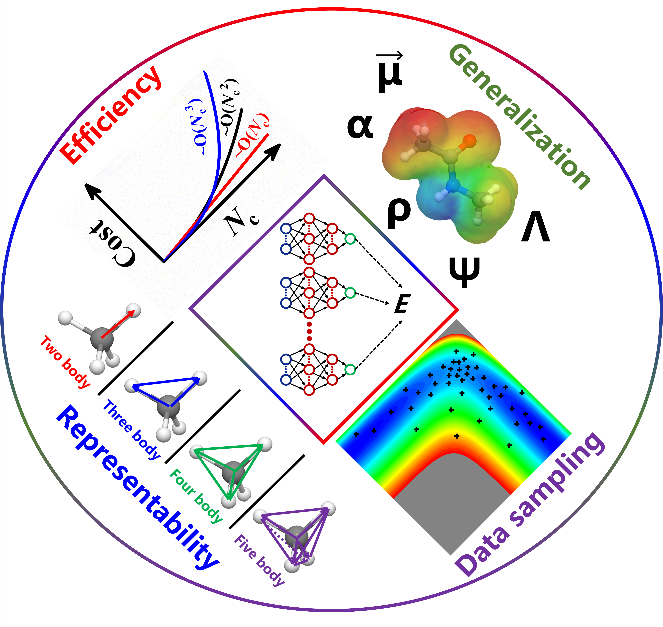 蒋彬教授课题组从2017年起在AtNN势能面和化学性质预测方面发表了一系列工作。在这篇综述中,蒋彬教授课题组介绍了AtNN模型的基本概念和其背后的物理思想,全面考察了现有各种AtNN方法,以课题组发展的方法为牵引,分类讨论了各种AtNN方法中提升原子环境描述效率和表达力的策略。在效率方面,可以利用各种算法间接计算原子环境中的三体关联,实现对于环境中近邻原子数线性标度,代表方法有蒋彬教授提出的嵌入原子神经网络(EANN),其使用高斯原子轨道线性组合的平方来计算三体关联,显著提升了计算效率。在表达力方面,可以使用多个径向函数的组合来增强两体关联,例如,使用多个高斯原子轨道线性组合作为EANN方法的基函数;更进一步可以使用消息传递网络的形式,递归的引入环境依赖的信息,进而高效地计算高阶多体关联,并引入原子环境外的非局域相互作用,相较于完全基于局域多体描述符的AtNN可以显著提升模型的精度。论文中将不同课题组提出的方法归纳总结到几类策略中,为进一步提升AtNN方法的精度和效率提供了思路。