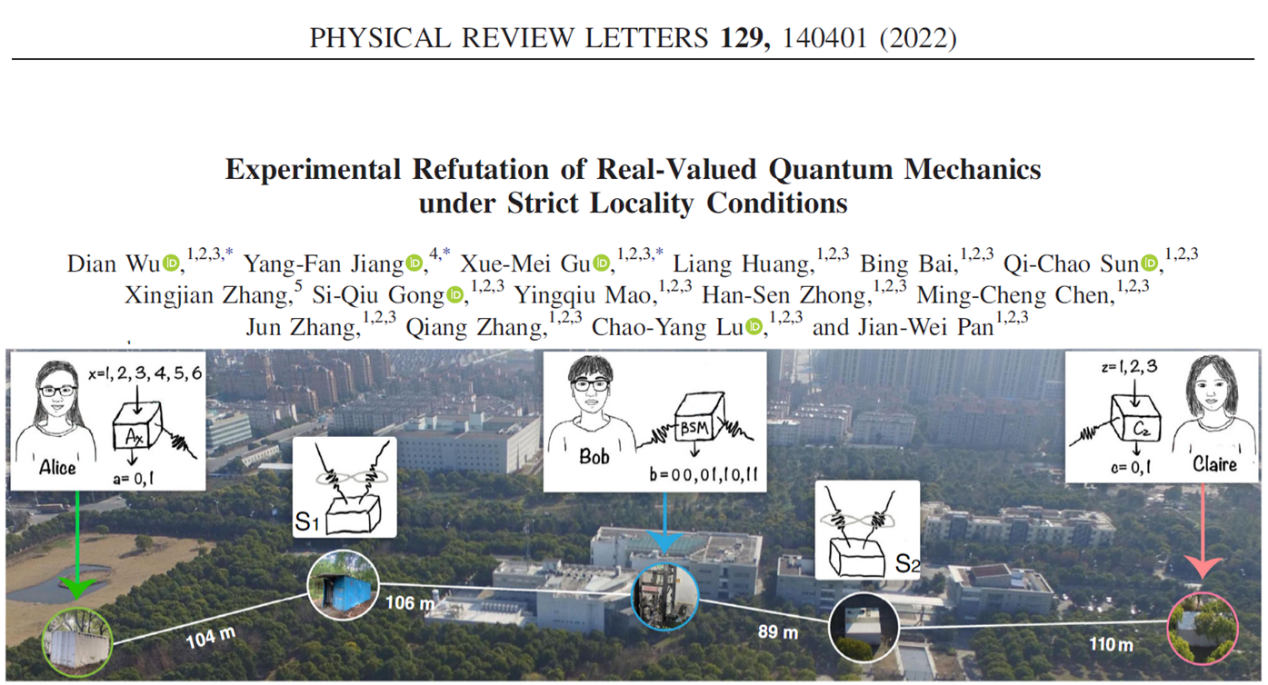 图5:严格非定域实数量子力学检验实验装置图。实验三方处于类空间隔,满足严格的爱因斯坦非定域性条件。来自吴典、江扬帆、顾雪梅等PRL129,140401 (2022)。