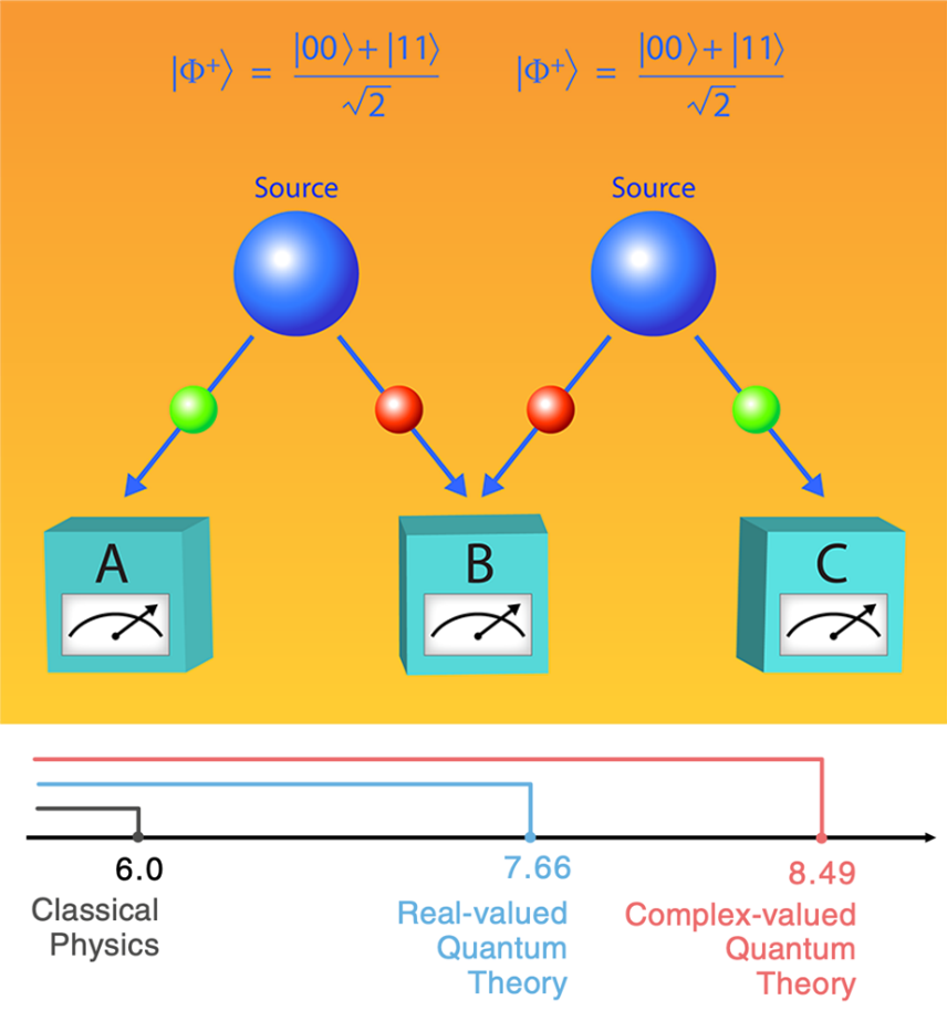如同1964年提出的贝尔不等式提供了检验1935年爱因斯坦和波尔论战的判据,检验复数在量子力学中的必要性的理论判据在2021年被提出来(Nature 600, 625–629 (2021))。这个理论测试方案可以被认为是一个三方非定域游戏:在一个纠缠交换网络中,三个参与者接收从两个互相独立的纠缠源产生的纠缠粒子,并各自独立地对接收到的粒子进行本地测量。遵守实数形式量子物理的三个参与者不能获得标准量子理论中允许的界限,从而可以排除以实数形式描述标准量子力学的可能性。这个实验不仅要求量子比特之间保持独立性,同时还要有极高的操纵精度和测量保真度,才能产生对实数量子力学模型的违背。