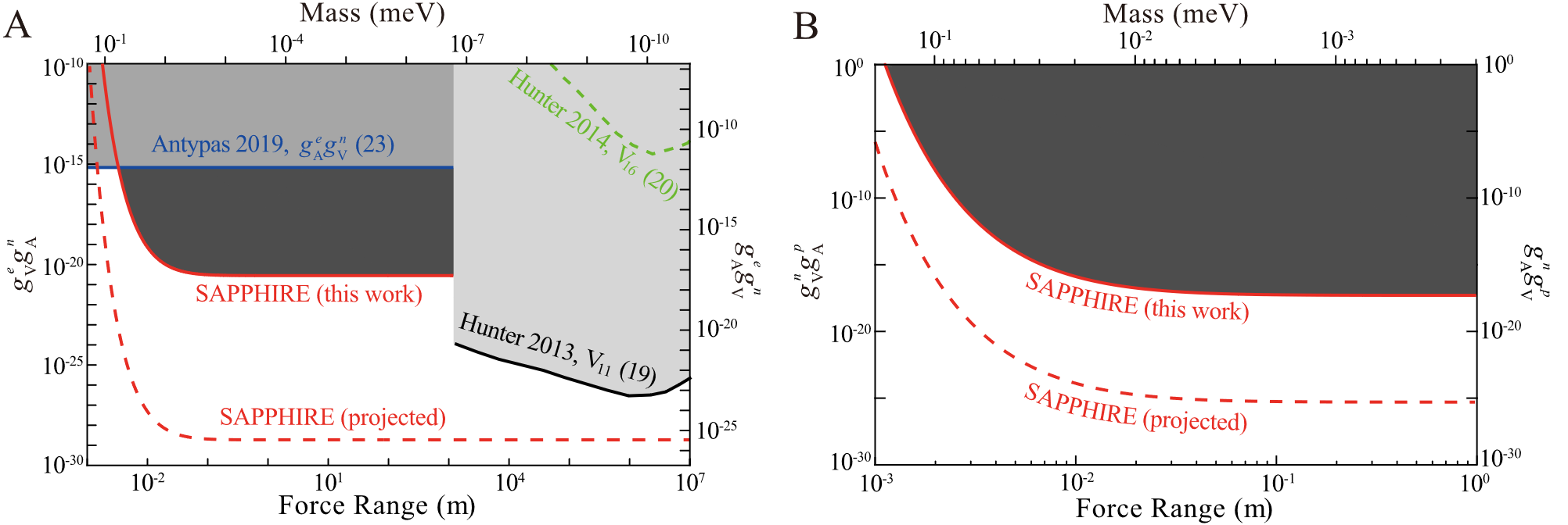 相较于其他应用于新物理搜寻的共振技术,量子自旋放大器中的铷原子充当嵌入式磁强计,实现了惰性气体氙原子的连续极化和原位测量。相比之下,原位测量提供的一个显著优势是由于大费米接触放大因子而增强核共振信号。此外,由于氙核自旋通过与极化铷原子的自旋交换碰撞而连续极化,自旋放大器可实现对奇异场的连续搜索。由于这些独特的优点,自旋放大器更适用于奇异相互作用的超灵敏连续波检测。正因如此,本实验对电子与中子之间的宇称破缺奇异相互作用的约束较国际前沿实验界限提高了5个数量级(如图2A),且对中子与质子之间的奇异相互作用进行了首次探索(如图2B)。不仅如此,SAPPHIRE计划仍有很大的性能提升空间,研究人员提出利用K-3He自旋放大器与固体自旋源,有望将对此类奇异相互作用的实验约束界限进一步提升8个量级。