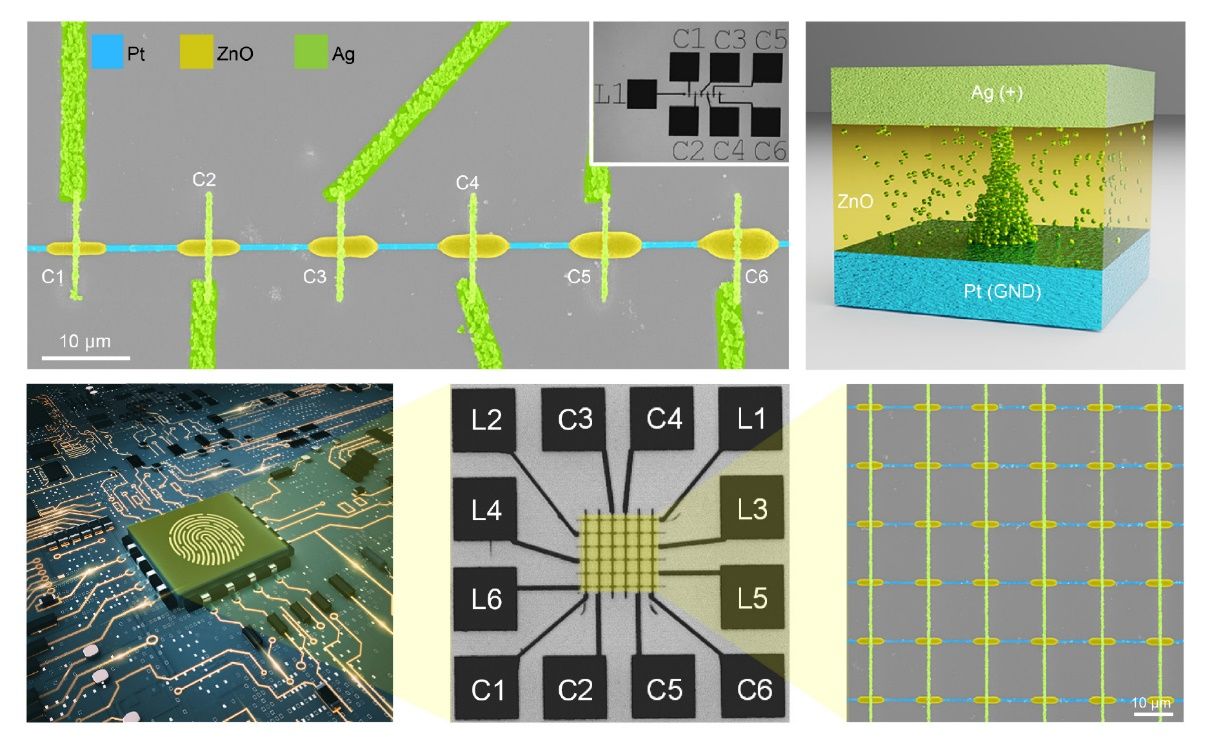 在这篇论文中,杨亮研究员与德国及澳大利亚的研究人员合作,创新性地开发了激光打印作为一种功能性电子器件打印技术,在单一激光加工系统中实现了半导体(ZnO) 和导体(Pt 和 Ag)等多种材料的复合激光打印(图1),并且完全不需要任何高温后处理工艺步骤,最小特征尺寸<1 µm。 这一突破使得可以根据微电子器件的功能对导体和半导体,甚至是绝缘材料的布局进行定制化设计和打印,极大地提高了微电子器件打印的精度、灵活性、可控性。在此基础上研究团队成功实现了二极管、忆阻器和物理不可复制加密电路的一体化激光直写(图2)。该技术与传统的喷墨打印等技术兼容,并且有望推广至多种P型、N型半导体金属氧化物材料的打印,为复杂、大尺寸、三维功能微电子器件的加工提供了系统的新方法。