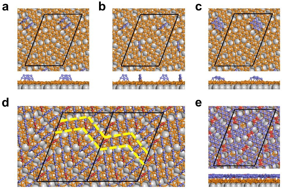 研究进一步表明,硼团簇在单层硼烯紧密堆积吸附之后,将表现出“多米诺骨牌效应”般的结构转变,B5团簇从“立式”变成“躺式”,相邻B5团簇之间形成化学键,导致其自发转变为双层硼烯,表明具有独特尺寸和规则排列的硼团簇对于二维硼烯和硼化学研究至关重要,填充了硼团簇结构和表面二维双层硼烯结构之间演变过程的空白(图4),首次阐明了前期合作工作中所发现的双层硼烯结构的形成机理(Nature Chem. 2022, 14, 25)。