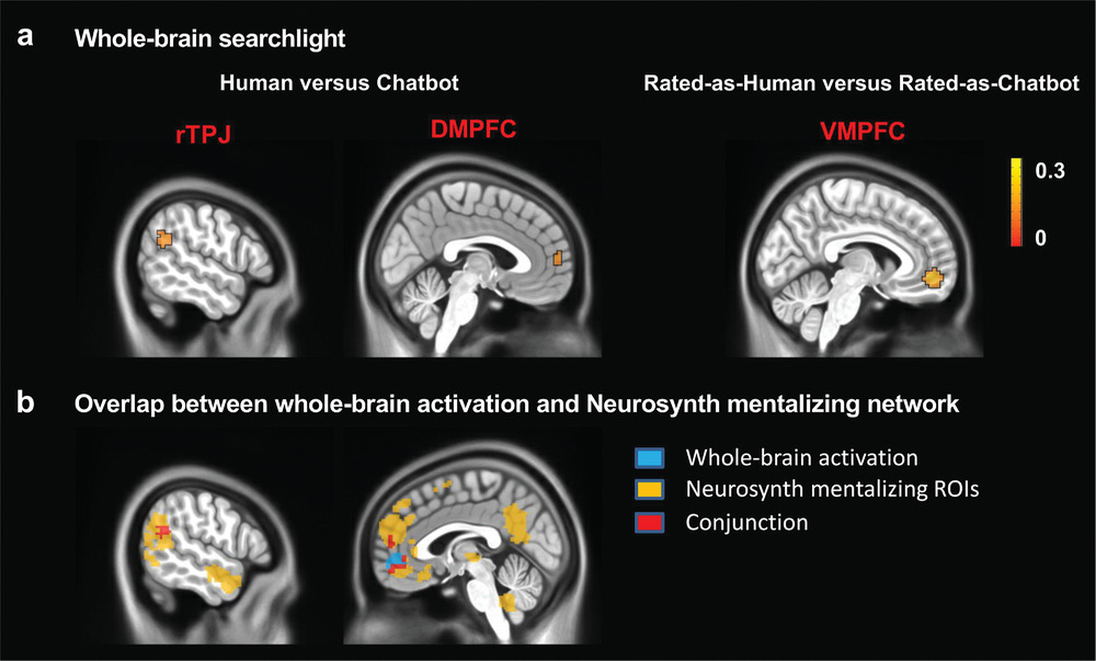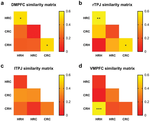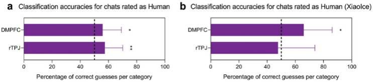 该研究收集了聊天机器人谷歌Meena和微软XiaoIce的语料作为自然语言生成语言的代表,同时收集了人类语料作为对照材料,采用功能磁共振成像技术记录受试者在浏览评估两种语料过程中的神经信号。结果分析发现,当受试者主观无法区分语料来源的时候,即主观判定人类语料和机器人语料都是人类语料的情况,大脑心智化脑网络的核心脑区背内侧前额叶和右侧颞顶联合区的激活水平依然可以显著区分语料的来源(图1)。不同来源和不同判定的语料所引起的神经活动在受试者之间表现出了显著的相似性(图2)。