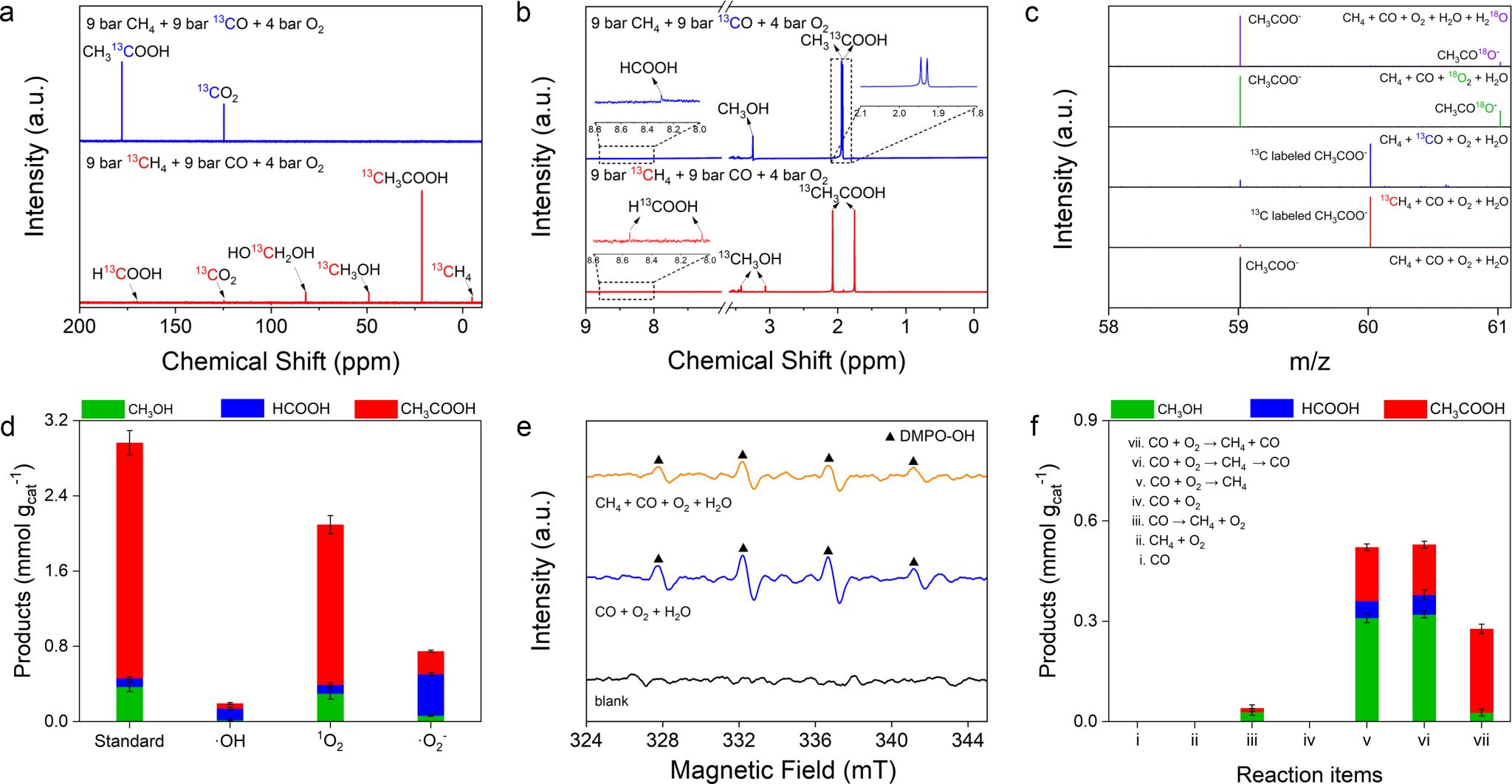 由于甲烷的化学惰性和氧气的低活性,在低温下以氧气氧化甲烷制乙酸面临重大挑战。在甲烷和氧气体系内引入一氧化碳提供了一条非常有前景的路线用于乙酸合成。在该反应中,一氧化碳作为还原剂、配体和反应物的作用已被广泛认识。但是这些催化剂通常需要在150摄氏度左右实现甲烷氧化制乙酸,在较低温度时几乎没有乙酸生成。目前,在低温下将甲烷氧化为乙酸通常依赖于强氧化剂的使用,如过氧化氢或过硫酸钾与三氟乙酸的混合物。有鉴于此,探究一氧化碳以及溶剂水的其它作用以实现低温下氧气氧化甲烷制乙酸具有重要意义。
