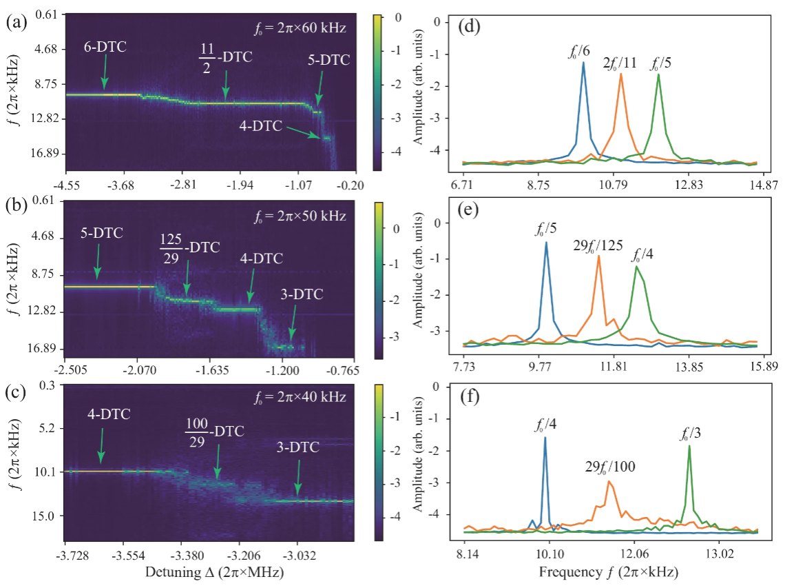 图3分数离散时间晶体,(a-c)分数离散时间晶体的相图,(d-f)分数离散时间晶体的傅里叶频谱。