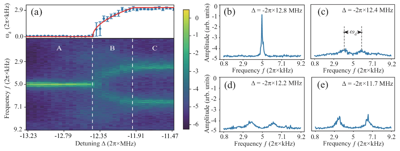 有趣的是,当物理系统远离热平衡状态时,人们可以观察到稳定的耗散时间晶体、预热离散时间晶体等奇异的物态现象。强相互作用的里德堡原子系统是研究非平衡动力学的理想平台之一。丁冬生、刘邦等人通过在周期性驱动的里德堡原子系统中,通过调节系统参数,观察到了强相互作用里德堡原子气体中的高阶以及分数离散时间晶体。在实验上得到了不同离散时间晶体的相图,观察到了整数阶离散时间晶体的相变过程,如图2所示。同时通过扫描系统参数,观察到了分数时间晶体存在的证据,如图3所示。对于这些现象的研究将有助于我们加深对时间晶体这种特殊物质状态的理解,为探究量子系统的非平衡动力学提供一个平台。
