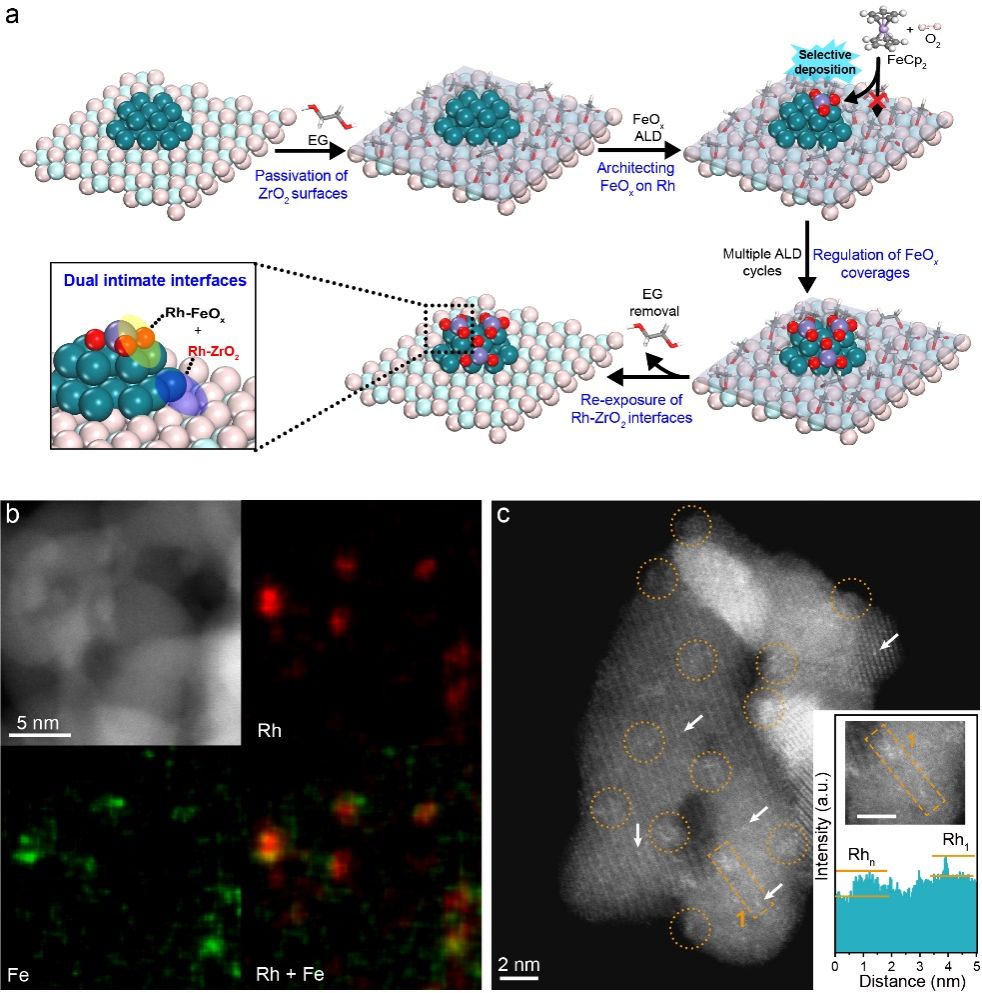 图2.FeOx-Rh-ZrO2双界面催化剂原子级精准组装与电镜表征。(a)选择性沉积策略构筑双界面示意图。(b)元素面分布图。(c)原子分辨电镜图;黄色虚线圈指示Rh团簇,白色箭头指示孤立Rh单原子,内插图表示黄色矩形区域的信号强度分布。