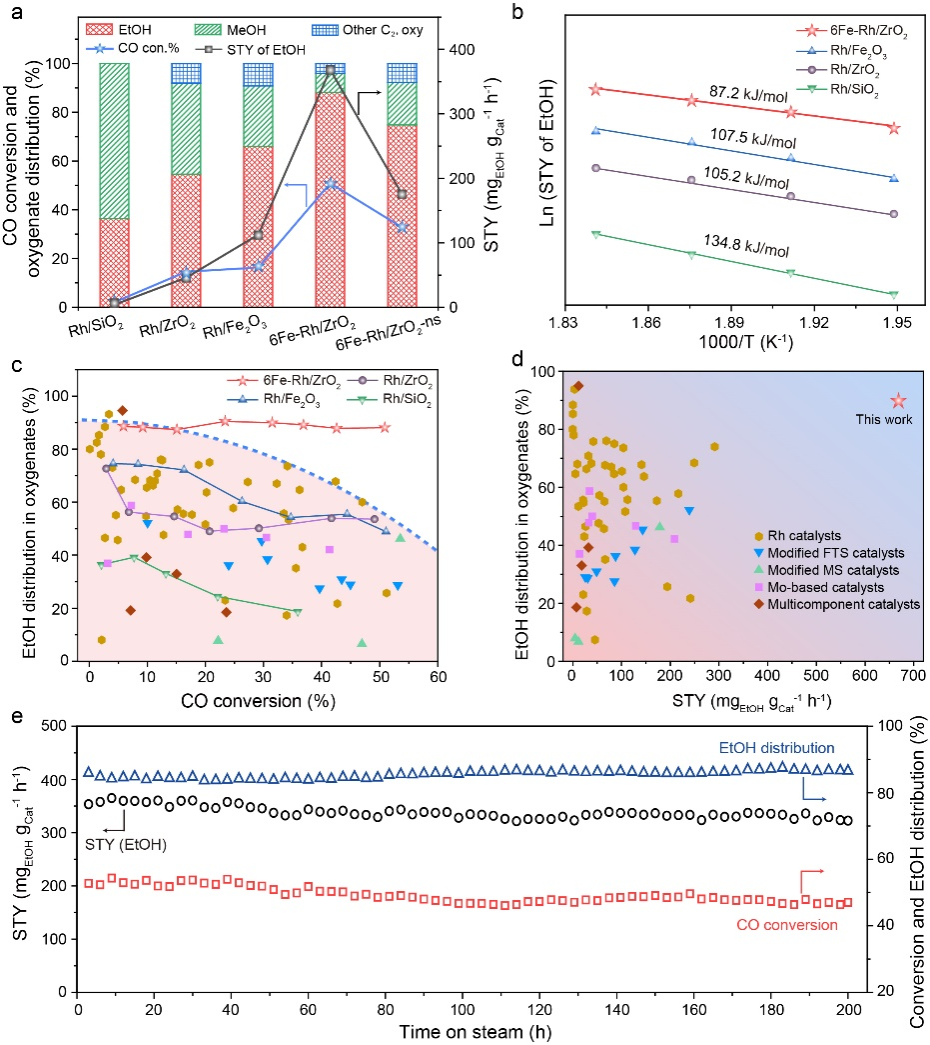 图3.合成气制乙醇催化性能。(a,b)FeOx-Rh-ZrO2双界面与Rh/ZrO2、Rh/Fe2O3和Rh/SiO2单界面催化剂的催化活性和活化能对比。(c,d)FeOx-Rh-ZrO2双界面催化剂和文献中报道的Rh基、改性甲醇合成、改性费托合成、Mo基等催化体系对比。(e)催化稳定性。