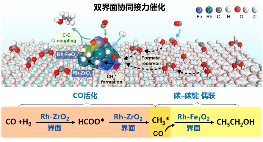 中国科大路军岭教授、王恒伟特任副研究员团队与刘进勋教授团队合作,发展了双界面协同串联催化新策略,通过原子精准级构筑功能互补的FeOx-Rh-ZrO2双界面催化剂,在合成气直接催化转化制乙醇研究中取得重大突破,实现了高转化率、高选择性和高稳定性乙醇定向合成。研究成果以“Atomically‒intimate assembly of dual metal‒oxide interfaces for tandem conversion of syngas to ethanol”为题,于11月25日发表在《自然·纳米技术》上(NatureNanotechnology,2024,DOI:10.1038/s41565-024-01824-w)。