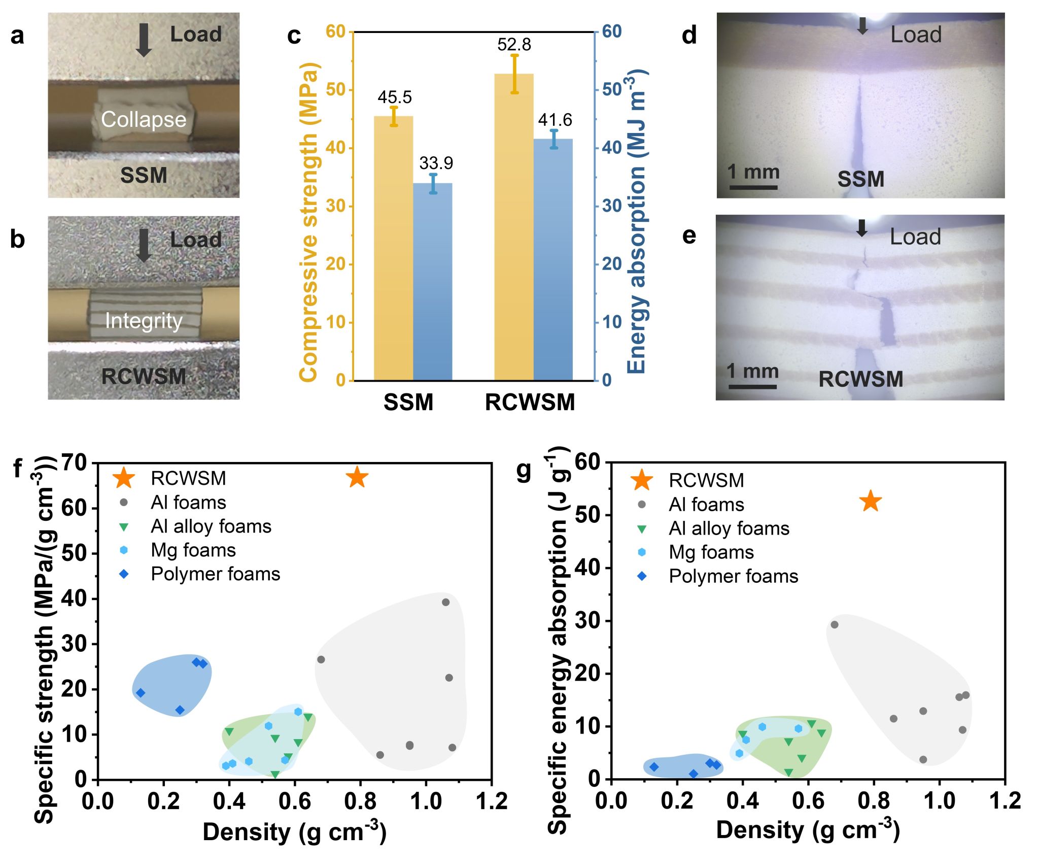 图2.RCWSM与三明治结构(SSM)材料的失效行为对比,以及RCWSM与其他传统吸能材料的密度、比强度和比能量吸收对比。
