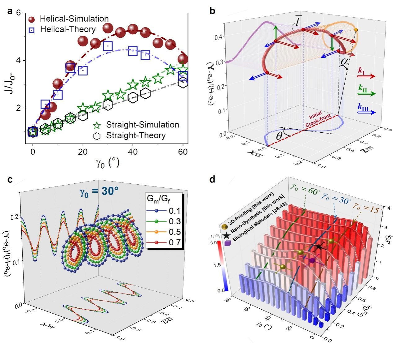 针对上述问题,研究人员以仿生扭转纤维结构作为代表性非均质系统模型,通过3D打印样品的断裂测试表征,发现了局部结构取向关联的三维螺旋状裂尖构型(图1e-f)。系统的模拟和理论分析表明(图2a-c),非均质结构影响裂纹前沿的驱动力并引发了空间位置依赖的I+II+III型混合断裂模式,裂尖的协同偏折与扭转导致螺旋裂尖几何的形成,裂尖几何、断裂韧性与纤维取向之间存在非线性关联规律,与线性增韧规律的对比表明裂纹三维扭曲几何存在额外的增韧效应。最后,研究人员提出了优化组分性质和结构取向实现三维螺旋裂尖扩展、提升材料抗断裂性能的设计方案(图2d)。