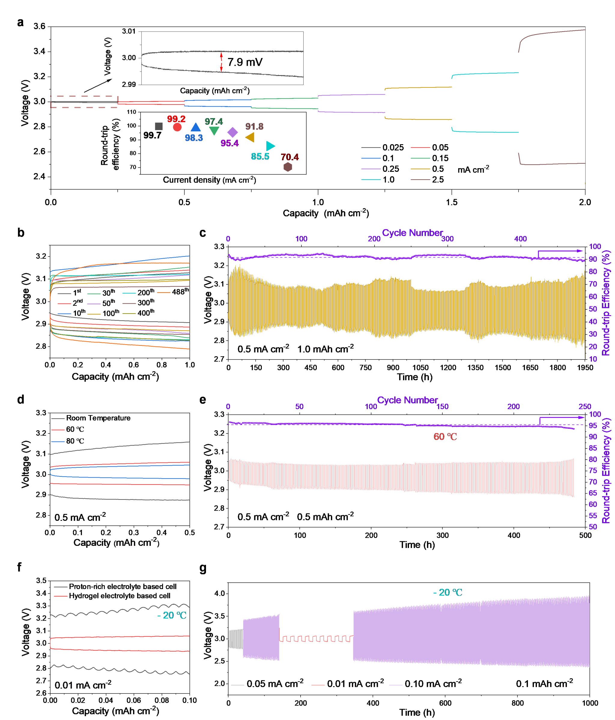 图二:Li-H电池综合电化学性能展示。a倍率性能;b-c长循环稳定性;d-e高温性能;f-g低温性能。