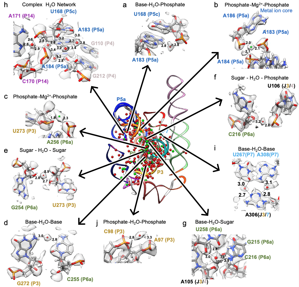 在最新发表的Nature论文中,研究团队聚焦于RNA结构中的水分子作用,通过Cryo-EM,获得了2.2 Å 和 2.3 Å分辨率的Tetrahymena核酶结构。这项研究的亮点包括:1)首次直接观察到RNA核心区域的水分子网络,并揭示水分子如何在RNA的非经典相互作用中发挥桥接作用。2)结合分子动力学模拟(MD),发现某些区域的水分子存在高度动态的行为,传统的结构解析方法难以捕捉。3)开发了基于密度分割的水与离子建模方法(SWIM),能够自动化建模并交叉验证RNA结构中的水分子和Mg⟡⁺离子,提高了水网络解析的准确性。