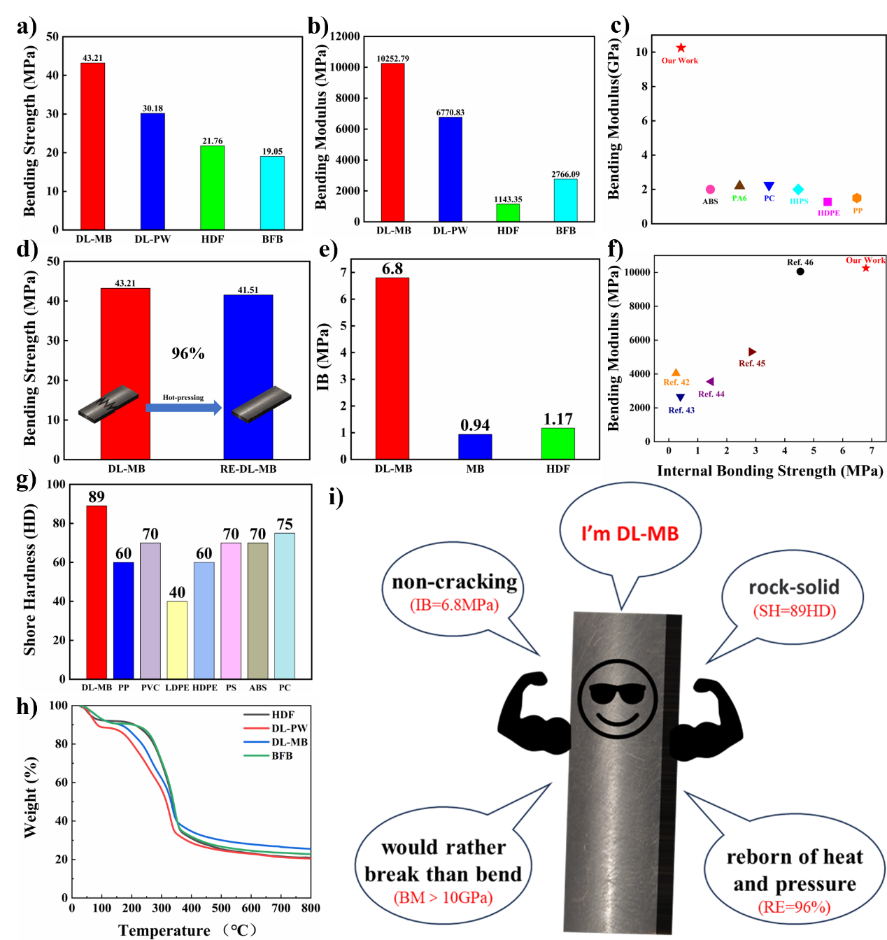 2022年6月举行的全球发展高层对话针对目前面临的不可生物降解塑料问题,提出了“以竹代塑”的重要课题,引起了广泛关注,特别是中国也将此项工作列入重点。但其中一个需要迫切解决的突出问题是寻找绿色的粘合剂。酚醛树脂、脲醛树脂等主流胶粘剂中含有有害物质。开发环保且经济有效的粘合剂至关重要。课题组利用均来自生物质的木质素和香草醛为原料,合成了一种新型的木质素基绿色粘合剂,实现了对竹子的特殊粘合强度。与传统的替代品相比,它可以与竹粉高效结合,制备的材料具有低成本、高机械强度、保温、防水、抗霉、和长期生物降解性特性,特别是得到板材的力学性能全面超越目前市场上常用的各种塑料产品(图4),为真正实现“以竹代塑”提供了新的解决方案,该成果近期发表于化工专业顶级期刊《化学工程杂志》(Chemical Engineering Journal,Chem. Eng. J.)。原文链接:https://www.sciencedirect.com/science/article/pii/S1385894725023307