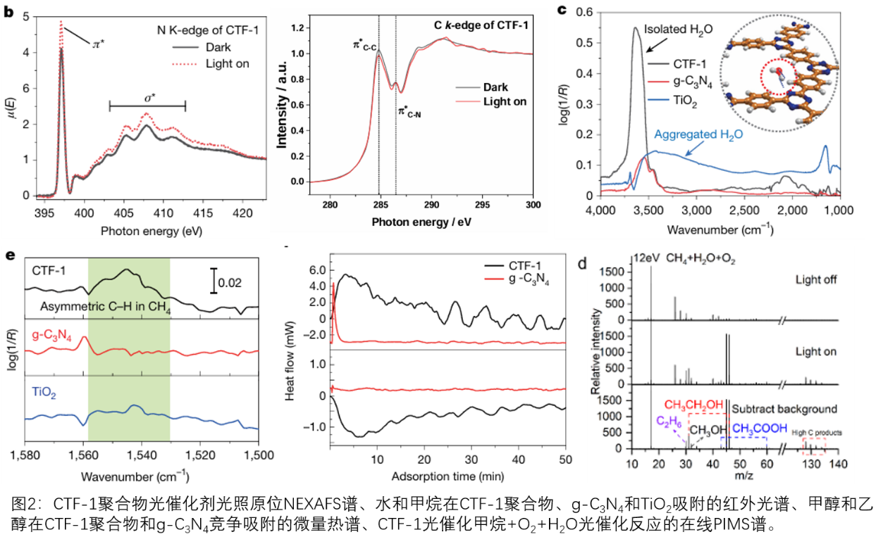 中国科学技术大学黄伟新教授合作开展了系统的CTF-1聚合物,及对照催化剂g-C3N4和TiO2,光催化甲烷+O2+H2O反应表界面化学研究。利用自行发展的光照原位X-射线近边吸收谱数据分析方法(ACS Catal.12(2022) 6457)观察到CTF-1聚合物光照产生的光生电子和空穴分别聚集在苯环和三嗪单元,对比研究反应物分子甲烷和水在CTF-1聚合物、g-C3N4和TiO2的吸附提供了CTF-1聚合物对甲烷和水独特的吸附活化行为,利用自行建立的吸附微量热技术(Rev. Sci. Instrum. 89 (2018) 064101)和脉冲化学吸附技术提供了CTF-1聚合物强吸附甲醇附产物分子和弱吸附乙醇目标产物分子的实验证据,以及利用高灵敏度同步辐射单光子电离质谱仅在甲烷+O2+H2O光催化反应体系在线检测到光催化中间产物乙烷(图2)。这些结果与英国伦敦大学学院/香港大学Zheng Xiao Guo教授课题组的其它实验表征结果、英国卡迪夫大学/伦敦大学学院C. Richard A. Catlow教授课题组的理论模拟结果相互印证,揭示了CTF-1聚合物苯环-三嗪单元分子内结实现光生电子电子和空穴的空间分离,以及由此引发的甲烷氧化和氧气还原位点的空间分离,反应中间体甲基自由基和乙烷与具有强氧化性的羟基自由基的空间分离的新机制,理解了CTF-1聚合物高效光催化甲烷+O2+H2O反应定向生成乙醇的反应机理和构-效关系。该研究也在国际上首次提出了分子内结(intramolecular junction)调控光生电子和空穴动力学的新概念,为分子基高效光催化剂创制提供了新思路。