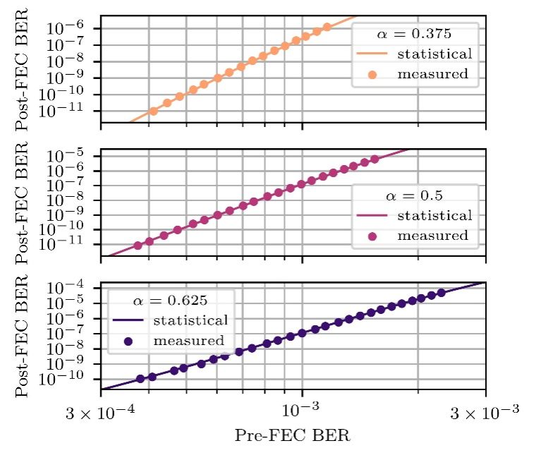 为了解决这一问题,该团队提出了一种新型误码率理论模型——Multi-Burst模型。传统方法通常采用马尔可夫模型对DFE引起的误码传递(error propagation)现象进行建模,并基于网格图(trellis)的动态规划算法推导单个FEC帧内的错误分布,从而计算FEC纠后误码率。与此不同,Multi-Burst模型的创新性在于:将单个FEC帧内的多段突发误码(burst error)视为近似相互独立的事件,而非马尔可夫模型中彼此关联的状态。具体而言,该模型首先通过突发误码表(burst table)描述单段突发误码的统计规律,再结合多段突发误码表的统计学关联,综合评估其对系统误码率的整体影响。