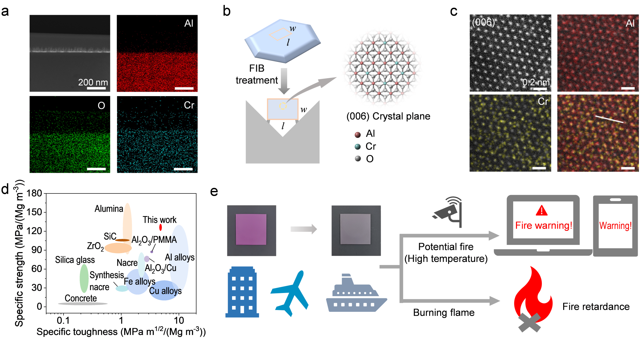 图2.(a)氧化铝微米片截面透射电镜元素分布图;(b)聚焦离子束技术沿着(006)晶面对铬掺杂的氧化铝微米片进行精确加工;(c)铬掺杂的氧化铝微米片原子级透射电镜元素分布图;(d)仿生复合材料机械性能的Ashby图;(e)仿生复合材料的主动早期火灾预警与被动防火阻燃功能示意图。